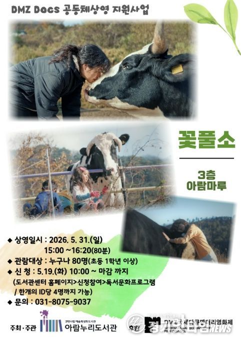 [경기핫타임뉴스=김형철 기자] 고양특례시 아람누리도서관은 DMZ국제다큐멘터리영화제와 협업해 오는 5월 31일 오후 3시, 도서관 3층 아람마루에서 다큐멘터리 영화 ‘꽃풀소’ 상영회를 개최한다.