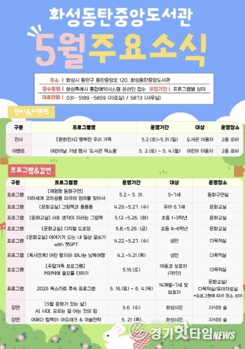 [경기핫타임뉴스=김삼영 기자] 화성동탄중앙도서관이 어린이날과 가정의 달을 맞아 5월 한 달간 도서관 이용자와 시민을 대상으로 자료실과 3층 공공의 마당 등에서 다양한 문화행사를 운영한다.