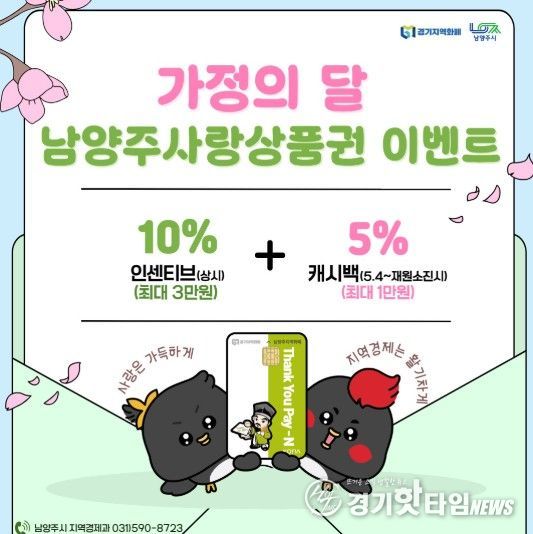 [경기핫타임뉴스=김형철 기자] 남양주시는 남양주사랑상품권 인센티브 예산을 확대하고 5월 가정의 달을 맞아 특별 혜택을 제공한다고 27일 밝혔다.