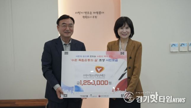 [경기핫타임뉴스=김삼영 기자] 수원시청소년청년재단은 28일, 수원시자원봉사센터와 수원 독립운동의 길 추진위원회가 주관하는 ‘수원 독립운동의 길’ 조성 시민 모금에 재단 임직원이 자율적으로 모금한 125만원을 기부했다고 밝혔다.