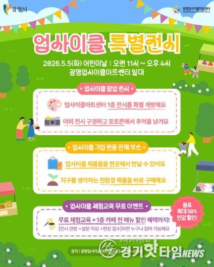[경기핫타임뉴스=김삼영 기자] 광명시 광명업사이클아트센터는 오는 5월 5일 어린이날을 맞아 자원순환 가치를 예술과 체험으로 즐기는 ‘업사이클 특별전시’를 운영한다.