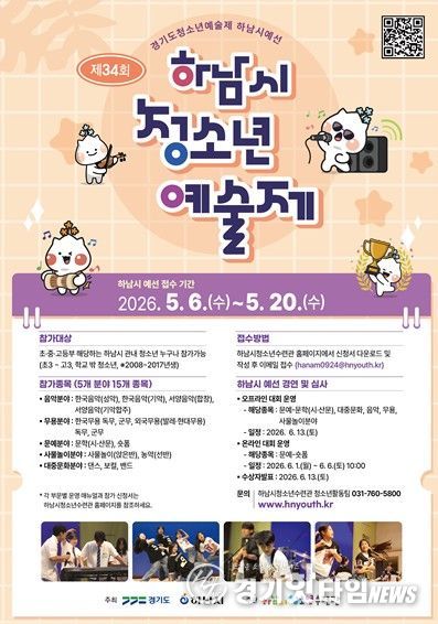 [경기핫타임뉴스=김형철 기자] 하남시가 주최하고 하남시청소년수련관이 주관하는 ‘2026 제34회 하남시청소년예술제’가 오는 6월 13일 하남시청소년수련관에서 개최된다.