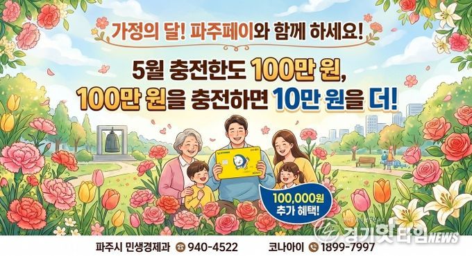 [경기핫타임뉴스=김형철 기자] 파주시는 5월 가정의 달을 맞아 5월 1일부터 5월 31일까지 한 달간 지역화폐 파주페이의 월 충전한도를 기존 70만 원에서 100만 원으로 상향한다.