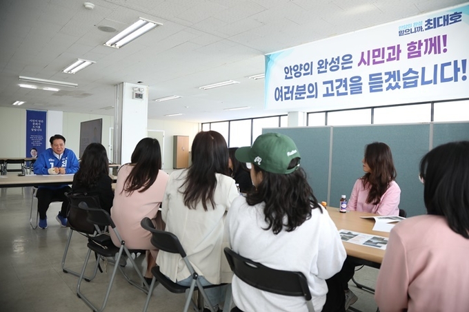 [경기핫타임뉴스=김삼영 기자] 최대호 더불어민주당 안양시장 후보가 임곡중학교 학부모회, 건축사협회, 재건축추진연합회 단체들을 잇달아 만나 정책간담회를 여는 등 소통 행보를 이어가고 있다.