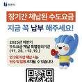 [경기핫타임뉴스=김형철 기자] 부천시는 안정적인 수도 공급과 건전한 재정 운영을 위해 11월 25일부터 12월 19일까지 ‘수도요금 체납액 특별정리기간’을 운영하고 있다. 이에 따라 시는 체납 2회 이상 또는 체납액 20만 원 이상인 617건을 집중적으로 관리하며 징수 활동을 벌이고 있다. 특히 시는 징수 독려반을 편성해 전화, 문자, 방문 등을 통해 자진 납부를 유도할 계획이다. 특히 고액·상습 체납자에 대해서는 급수정지 등 강력한 행정조치를 실시하고, 급수시설 소유자에게 체납 사실을 통보하는 한편, 재산조회와 압류를 통해 채권 확보에도 나설 방침이다. 또한 이번 기간에는 QR코드를 활용해 시민들이 수도요금을 보다 쉽게 조회할 수 있도록 안내하고 있다. 납부는 가상계좌, 위택스, 인터넷지로, 부천시 상하수도 요금납부 사이버창구 등 다양한 방법으로 가능하며, 사이버창구에서는 자동납부 신청도 간편하게 할 수 있다. 부천시 관계자는 “이번 정리 기간은 시민 불편을 최소화하면서 체납액을 효율적으로 정리하기 위한 것”이라며 “기한 내 납부하지 않을 경우 부득이하게 재산 압류나 급수정지 등 불이익이 따를 수 있어 자발적