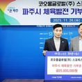 [경기핫타임뉴스=김형철 기자] 파주시는 코오롱글로벌㈜이 지난 26일 파주시 체육 발전을 위한 기부금 2천5백만 원을 전달했다고 밝혔다. 이날 행사에는 김경일 파주시장, 송승회 코오롱글로벌㈜ 부사장 등이 참석해 지역사회의 체육 기반 강화에 대한 상호 협력 의지를 확인했다. 코오롱글로벌㈜의 계열사인 코오롱스포렉스는 관내 6개의 스포츠센터를 위탁 운영하고 있으며, 전국적으로는 26개 운영 지점을 운영하고 있다. 40년간 축적한 체육시설 운영 경험을 바탕으로 공공체육시설 운영의 전문성을 높여 왔다. 송승회 코오롱글로벌㈜ 부사장은 “지역사회와 함께 성장하는 것이 기업의 중요한 책무”라며, “이번 기부를 계기로 파주시민의 체육 복지 향상에 더욱 힘쓰겠다”라고 말했다. 김경일 파주시장은 “해마다 체육 발전을 위해 기부금을 전달해 주셔서 감사드린다”라며, “기부금은 시민 생활체육 활성화, 청소년 체육 지원, 체육시설 확충 등 지역 체육 진흥을 위한 다양한 사업에 유용하게 활용하겠다”라고 말했다. 한편, 코오롱글로벌㈜은 매년 김장 담그기, 환경정화 활동, 사랑애(愛) 연탄 나눔 행사 등에 참여해 왔으며