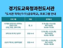 [경기핫타임뉴스=김삼영 기자] 경기도교육청과천도서관이 학생들의 자기주도 학습 역량과 창의적 사고력 함양을 위해 ‘도서관 작작(作作) 공유학교’를 운영한다. 오는 5월부터 10월까지 운영되는 ‘도서관 작작(作作) 공유학교’는 독서 기반의 체험과 창작 활동을 결합한 과천도서관의 특화 공유학교 프로그램이다. 프로그램은 초등학생(4~6학년)과 청소년을 대상으로 운영되며 디지털 콘텐츠 창작, 과학·진로 탐색, 인공지능 활용, 경제·창업 체험 등 다양한 분야의 융합형 교육과정으로 구성했다. 청소년 대상 과정인 디지털 드로잉을 활용한 콘텐츠 창작 프로그램은 초급·중급·심화 단계로 운영해 아이디어를 시각적으로 표현하고 스토리텔링 역량을 확장할 수 있도록 했다. 초등학생 대상 프로그램으로는 과학 탐구와 독서를 연계한 진로 탐색 활동, 인공지능을 활용한 동화책 제작, 경제 개념을 체험 중심으로 익히는 프로그램, 아이디어를 실제 결과물로 구현해보는 창업 활동, 이모티콘 제작을 통한 콘텐츠 창작 활동 등 다양한 체험 중심 과정이 운영된다. 각 프로그램은 소규모 참여형 수업으로 운영되며 학생의 수준과 흥미를