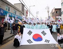 [경기핫타임뉴스=김형철 기자] 양주시가 1일 가래비3·1운동순국기념사업회 주관으로 양주시 광적면 소재 3·1운동 기념공원에서 '제107주년 양주 가래비 3·1운동 기념식 및 재연행사'를 개최하고 순국선열의 숭고한 희생정신을 기렸다. 이날 행사에는 양주시와 양주시의회, 경기북부보훈지청, 동두천양주교육지원청, 농협은행 양주시지부 등 기관 관계자와 독립유공자 유가족, 보훈단체 관계자, 사회단체장, 시민 등 600여 명이 참석했다. 행사는 국민의례를 시작으로 독립선언서 낭독, 기념사, 삼일절 노래 제창, 만세삼창, 기념공연, 거리만세행진 순으로 진행됐다. 기념 공연으로는 1919년 가래비 만세배미 현장을 재연한 창작 뮤지컬 ‘기억하라! 그날!’과 양주시립합창단 공연이 이어졌다. 시민들은 가래비 일대에서 전개됐던 만세운동을 재연하는 거리만세행진에 참여해 태극기를 흔들며 “대한독립 만세”를 외쳤다. 행사장에는 관내 독립운동가를 알리는 전시와 함께 시민이 태극기에 순국선열을 향한 감사와 소망의 메시지를 남기는 ‘시민 참여 보훈문화행사’도 마련됐다. 완성된 태극기는 양주시청 3층 갤러리에 전시될 예정이다. &nb