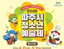 [경기핫타임뉴스=김형철 기자] (재)파주시청소년재단 금촌청소년문화의집은 오는 4월 21일부터 5월 9일까지 ‘2026 파주시청소년예술제’ 참가자를 모집한다고 밝혔다. 올해‘Be Happy, 무대위에 피어나다’를 부제로 개최되는 이번 예술제는 제34회 경기도청소년예술제 파주시 공식 예선으로, 파주시 청소년이라면 누구나 참가 신청이 가능하다. 이번 예술제는 경연분야와 공모분야로 나뉘어 진행된다. 경연분야는 총 4개 부문 13개 종목으로 구성되며, 5월 26일에는 사물놀이(앉은반·농악선반), 한국무용·외국무용(독무·군무), 댄스가, 5월 27일에는 한국음악(성악·기악)·서양음악(합창·기악합주)과 보컬이, 5월 28일에는 밴드 경연이 운정행복센터 공연장에서 펼쳐진다. 공모분야는 문예 부문으로 시·산문과 숏폼 두 종목이 운영되며, 올해 공모 주제는 '행복'이다. 참여 청소년 각자가 생각하는 행복을 자유로운 시각으로 표현할 수 있도록 의도적으로 열린 주제로 설정했으며, 심사는 5월 15일 숏폼, 5월 19일 시·산문 순으로 진행될 예정이다. 시상은 종목별 최우수상(파주시장상)·지도교사상(파주시장상)·우수상(경기도파주교육지