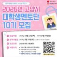 [경기핫타임뉴스=김형철 기자] 고양특례시가 지역 청소년들의 진로 설계를 도울 대학생 멘토단 ‘고양유니브’의 2026년도 신입 단원을 1월 18일까지 모집한다고 밝혔다. 고양형 청소년 진로체험 사업의 대표적인 사업인 ‘고양유니브’는 지역 출신 또는 거주 대학생들이 관내 중고등학생들에게 전공 학과 탐색과 진로 멘토링을 제공하는 프로그램이다. 특히 2026년은 2017년 출범 이후 10년을 맞이하는 해로, 그간의 운영 노하우를 집약해 더욱 내실 있는 프로그램이 운영될 전망이다. 지원 자격은 △고양시 내 중고등학교를 졸업한 대학생 △고양시에 거주 중인 대학생 △고양시 소재 대학교에 재학(또는 휴학) 중인 대학생이라면 누구나 가능하다. 다만, 대학원생은 제외된다. 선발 과정은 지원서의 충실성과 학과 구성의 다양성 등을 종합적으로 심사하여 진행된다. 최종 합격자는 2026년 1월 24일 고양시청소년재단 누리집을 통해 발표될 예정이다. 선발된 멘토들은 청소년들에게 생생한 학과 정보와 진로 상담을 제공하며, 이와 동시에 멘토들 간의 네트워킹 활동과 역량 강화 교육을 통해 개인의 성장 기회도 얻게 된다.