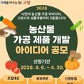 [경기핫타임뉴스=김형철 기자] 고양특례시는 농업인의 참신한 아이디어를 반영한 가공 제품을 발굴하고자 ‘2026년 농산물 가공 제품개발 아이디어 공모’를 실시한다. 이번 공모는 고양시에 식품 제조‧가공업을 등록한 농업인 또는 농업경영체를 대상으로 한다. 접수는 4월 6일부터 30일까지 고양시농업기술센터 방문이나 이메일을 통해서 가능하다. 제출된 공모안은 1차로 자격요건 확인 등을 위한 농가 현장조사가 이뤄진다. 이후 생산성, 상품성, 표준화, 사업성 등 4개 항목에 대한 2차 서면심사를 진행한다. 최종 선정된 아이디어는 전문가 컨설팅을 통해 가공제품 개발로 이어지며 농업인에게 기술을 이전해 상품화까지 지원할 예정이다. 고양시농업기술센터 관계자는 “이번 공모를 통해 지역 농산물을 활용해 창의적인 가공제품 아이디어를 발굴하고, 농가의 가공 관련 창업 경쟁력을 높이는 계기가 되길 기대한다”며 “앞으로도 농업인의 가공기술 역량 강화를 위한 지원을 지속하겠다”고 말했다.
