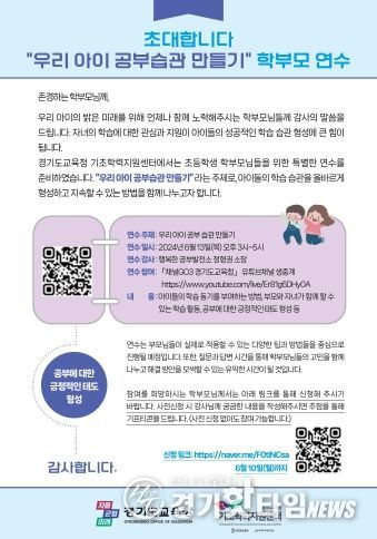 [경기핫타임뉴스=김삼영 기자] 경기도교육청이 13일 ‘우리 아이 공부 습관 만들기’를 주제로 2024 상반기 기초학력 보장 학부모 연수를 운영한다.