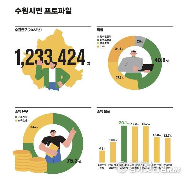 수원 가구의 65.7%는 ‘아파트’에 거주하고, 26.6%가 ‘연립다세대주택’, 5.3%는 ‘단독주택’, 2.3%는 ‘주택 외 기타’ 형태로 거주하고 있는 것으로 응답했다. 직업은 ‘화이트칼라’가 40.8%, ‘블루칼라’ 27.8%, ‘기타’ 24.4%, ‘관리전문직’ 7% 등의 순으로 나타났다. ‘근로소득이 있다’고 응답한 사람이 75.3%, ‘없다’고 응답한 사람은 24.7%였다. 소득은 ‘300만~400만원(20.1%)’, ‘400만~500만원(19.6%)’, ‘500만~600만원(19.7%)’ 등이 고르게 분포했다.