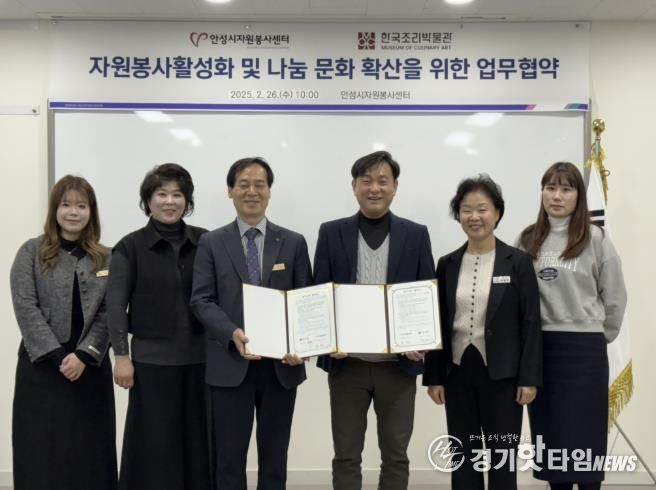 [경기핫타임뉴스=김삼영 기자] 안성시자원봉사센터는 2월 26일 한국조리박물관과 지역사회 자원봉사 활성화 및 나눔 문화 확산 등 공동 이익 증진을 위한 업무협약을 체결했다.