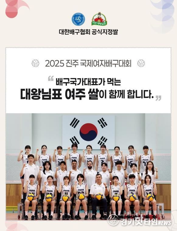 [경기핫타임뉴스=김형철 기자] 여주시 농산업 공동브랜드 활성화센터는 오는 8월 15일과 16일 양일 간, 경남 진주실내체육관에서 열리는 2025 코리아 인비테이셔널 진주국제여자배구대회 현장에서 ‘대왕님표 여주쌀’ 홍보 이벤트 부스를 운영한다고 밝혔다.