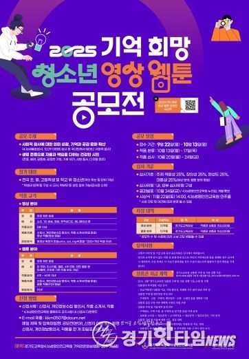 [경기핫타임뉴스=김삼영 기자] 경기도교육청4.16생명안전교육원이 ‘2025 기억 희망 청소년 영상‧웹툰 공모전’을 개최한다.