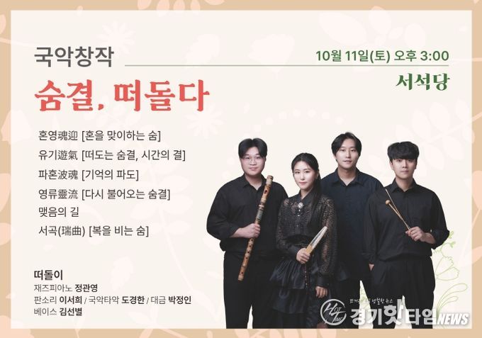 [경기핫타임뉴스=김삼영 기자] 광주문화재단(대표이사 노희용) 전통문화관은 오는 10월 11일 오후 3시, 토요 상설공연 22회차로 퓨전국악 단체 떠돌이의 '숨결, 떠돌다' 무대를 선보인다.