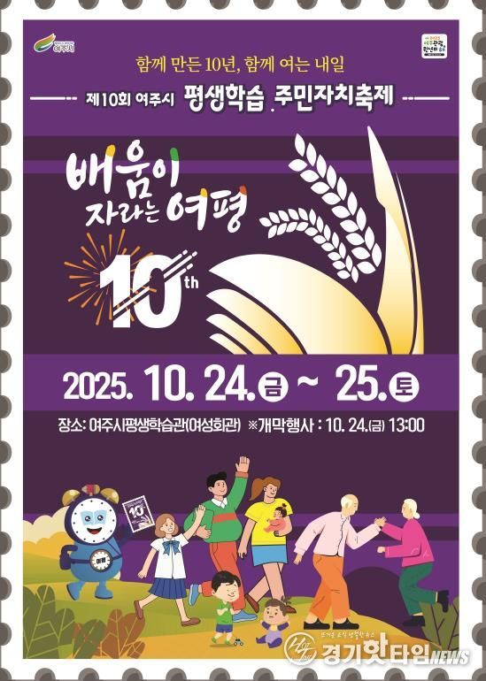 [경기핫타임뉴스=김형철 기자] 여주시는 오는 10월 24일부터 25일까지 이틀간 여주시평생학습관 일원에서 '제10회 여주시 평생학습·주민자치축제'를 개최한다. '배움이 자라는 여평 – 함께 만든 10년, 함께 여는 내일'을 주제로 열리는 이번 축제는 평생학습도시 여주시가 지난 10년간 시민과 함께 쌓아온 학습의 성과를 나누고, 앞으로의 10년을 새롭게 열어가는 의미 있는 자리로 마련됐다.