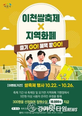 [경기핫타임뉴스=김형철 기자] 이천시는 2025 이천쌀문화축제 기간에 지역화폐 이용을 촉진하고 지역경제를 활성화하기 위해 코나아이(주)의 경기지역화폐 사회공헌 재원을 활용하여 ‘이천쌀축제, 지역화폐로 즐기고(GO), 혜택받고(GO)’ 이벤트를 추진한다고 밝혔다.
