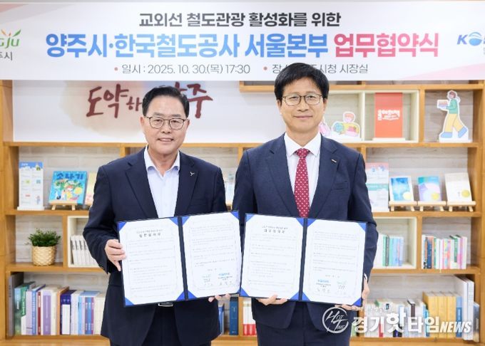 [경기핫타임뉴스=김형철 기자] 양주시가 지난 30일 시청 2층 집무실에서 ‘한국철도공사 서울본부’와 함께 ‘교외선 철도관광 활성화를 위한 업무협약’을 체결했다.