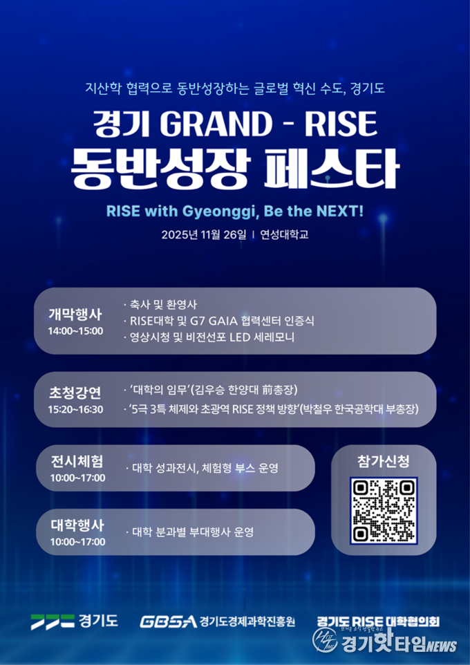 [경기핫타임뉴스=김삼영 기자] 경기도와 경기도경제과학진흥원(이하 경과원), 경기도 RISE 대학협의회가 오는 26일 연성대학교 연곡문화센터에서 ‘경기 GRAND-RISE 동반성장 페스타’를 개최한다고 18일 밝혔다.