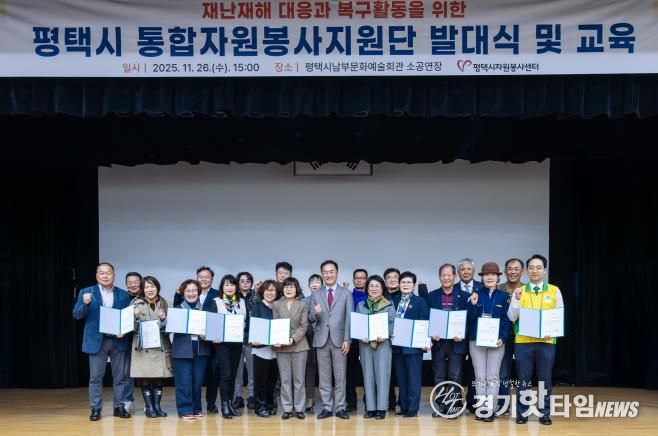 [경기핫타임뉴스=김삼영 기자] 평택시는 지난 26일 남부문예회관 소공연장에서 21개 자원봉사 단체가 참여한 가운데 ‘평택시 통합자원봉사지원단’발대식을 개최하고, 대규모 재난 발생 시 신속한 긴급 대응 체계를 본격 가동한다고 밝혔다.