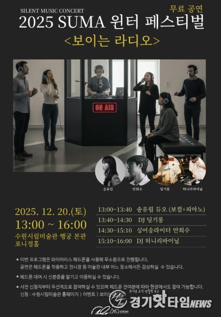 [경기핫타임뉴스=김삼영 기자] 경기도 수원시립미술관은 연말을 맞아 시민들에게 다양한 문화 체험 기회를 위한 2025 SUMA 윈터 페스티벌 '뮤지엄 라디오'를 12월 20일 오후 1시부터 4시까지 수원시립미술관 행궁 본관 로비에서 개최한다.