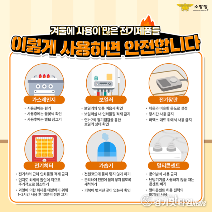 수원남부소방서에 따르면 겨울철 화재의 상당수가 난방기구 사용 부주의에서 발생하며, 특히 난방기구 주변에 이불이나 옷가지 등의 가연성 물질을 가까이 두는 경우 화재 위험성이 커진다고 밝혔다.