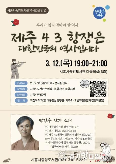 [경기핫타임뉴스=김삼영 기자] 시흥시중앙도서관은 오는 3월 12일 오후 7시, 시민을 대상으로 역사 인문 강연 ‘제주 4ㆍ3항쟁은 대한민국의 역사입니다’를 운영한다.