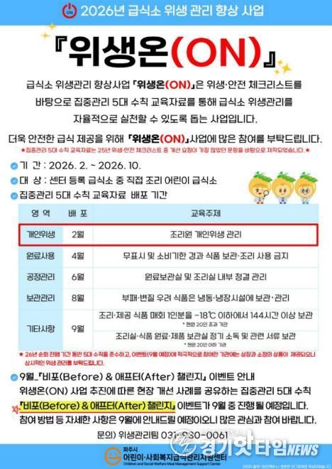 사업은 어린이급식소와 사회복지급식소의 특성을 고려한 맞춤형 구성으로 운영된다. 어린이급식소에서는 ▲집중 관리 5대 수칙 교육자료(5차시) 제공 ▲관리 전후 변화 실천 도전 ‘비포(Before) 앤드 애프터(After) 챌린지’를 운영하며, 사회복지급식소에서는 ▲영역별 중점 관리 수칙 교육자료(3차수) 제공 ▲현장 중심의 참여형 활동을 추진할 예정이다.