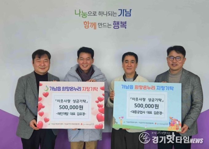 [경기핫타임뉴스=김형철 기자] 여주시 가남읍 행정복지센터는 지난 9일, 해인개발과 대흥공업사에서 관내 어려운 이웃을 위한 성금 각 50만 원을 기탁하고, ‘가남읍 희망온누리’ 정기기부에 신규 참여했다고 밝혔다.