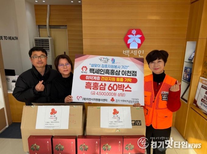 [경기핫타임뉴스=김형철 기자] (재)이천시자원봉사센터는 백세인흑홍삼이천점과 함께 설 명절을 맞아 취약계층을 위한 건강 지원 물품 기탁식을 진행했다고 밝혔다.