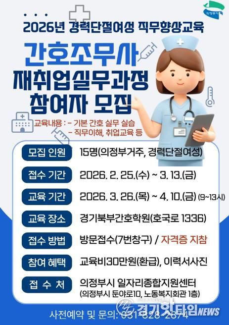 [경기핫타임뉴스=김형철 기자] 의정부시는 관내 경력단절여성 구직자를 위한 맞춤형 직업교육으로 ‘간호조무사 재취업 실무과정’ 참여자를 모집한다.