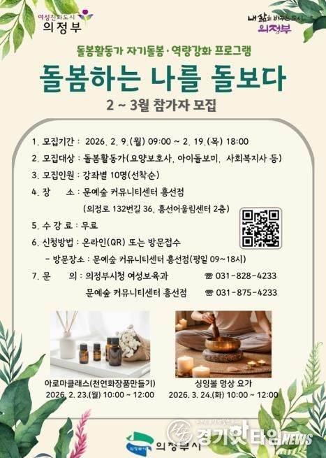 [경기핫타임뉴스=김형철 기자] 의정부시는 2월 9일부터 19일까지 돌봄활동가를 위한 자기돌봄·역량 강화 프로그램 ‘돌봄하는 나를 돌보다’ 2~3월 참가자를 모집한다.