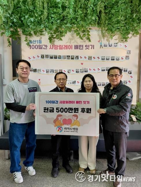 [경기핫타임뉴스=김형철 기자] 의정부시 송산1동주민센터는 2월 9일 용현동 소재 리하트병원이 ‘100일간 사랑릴레이 배턴 잇기’에 동참해 성금 500만 원을 기탁했다고 밝혔다.