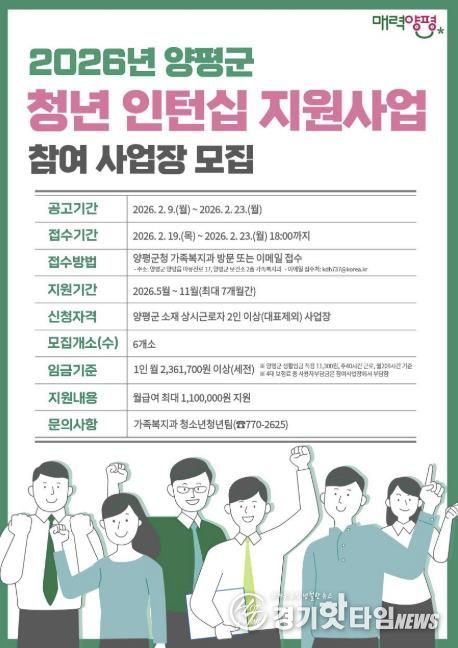 [경기핫타임뉴스=김형철 기자] 양평군은 인력이 필요한 관내 사업장과 관내 거주 미취업 청년을 연계하고 사업장에 인건비를 지원하는 ‘청년 인턴십 지원 사업’ 참여 사업장을 오는 2월 19일부터 23일까지 모집한다.