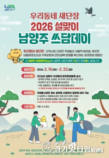 [경기핫타임뉴스=김형철 기자] 남양주시는 10일부터 22일까지 시 전역에서 ‘설맞이 우리동네 새단장 남양주 쓰담데이 집중 추진기간’을 운영한다고 밝혔다.