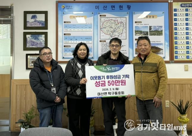 [경기핫타임뉴스=김형철 기자] 미산면 탁구동호회는 지난 9일 미산면 지역사회보장협의체에 이웃돕기 성금 50만원을 기탁했다.