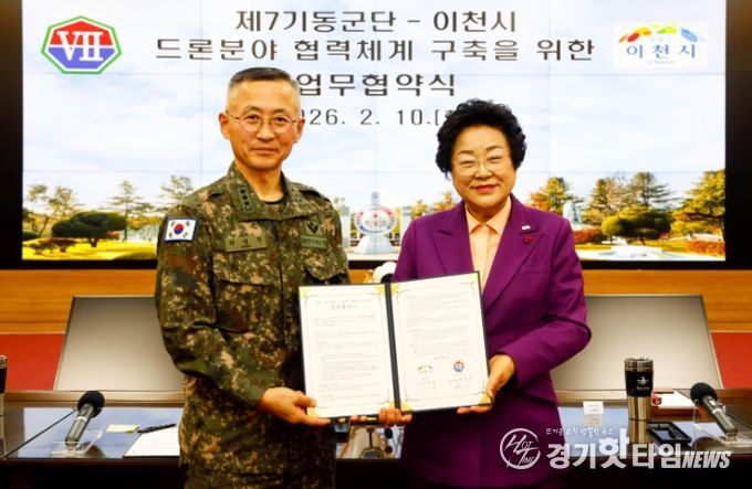 [경기핫타임뉴스=김형철 기자] 이천시는 2월 10일 제7기동군단 대회의실에서 제7기동군단과 ‘드론분야 협력체계 구축을 위한 업무협약(MOU)’을 체결했다. 이번 협약은 첨단 드론기술을 활용한 민·관·군 협력 기반을 마련하고, 지역 드론산업과 국방 분야의 상호 발전을 도모하기 위해 추진됐다.