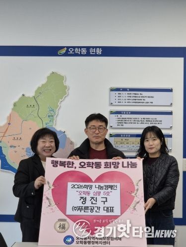 [경기핫타임뉴스=김형철 기자] 여주시 오학동은 ㈜푸른공간 정진구 대표가 지난 10일 오학동 행정복지센터를 방문해 이웃돕기 성금 50만 원을 기탁했다고 밝혔다.