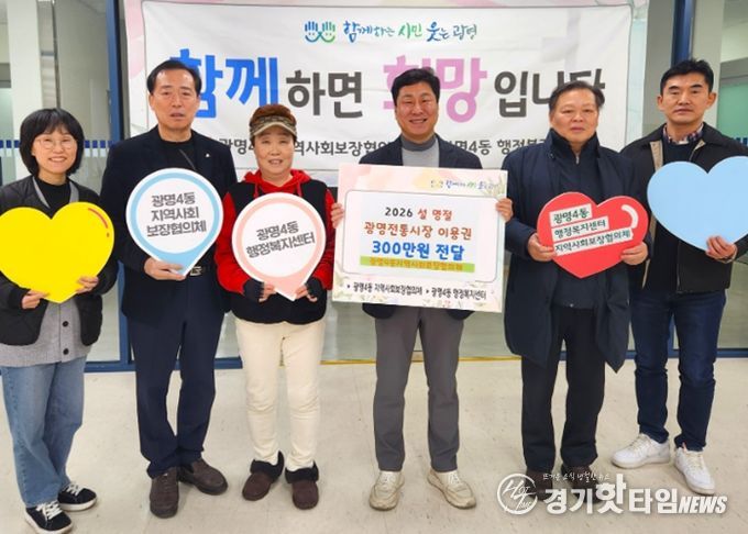 [경기핫타임뉴스=김삼영 기자] 광명시 광명4동 지역사회보장협의체는 11일 설 명절을 맞아 관내 저소득 취약계층 50가구에 총 300만 원 상당의 광명전통시장 이용권을 전달했다.