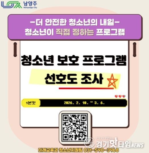 [경기핫타임뉴스=김형철 기자] 남양주시는 관내 청소년들의 안전과 권익을 보호하고, 수요에 기반한 실효성 있는 정책을 수립하기 위해 ‘청소년 보호 프로그램 선호도 조사’를 실시한다고 11일 밝혔다.