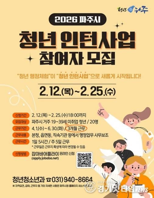 [경기핫타임뉴스=김형철 기자] 파주시는 관내 미취업 청년을 대상으로 운영하던 ‘청년 행정체험’사업을 올해부터 ‘청년 인턴사업’으로 개편하고, 근무기간을 기존 20일에서 3개월로 연장해 확대 운영한다.