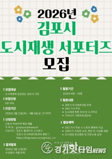 [경기핫타임뉴스=김형철 기자] 김포시는 다양한 도시재생사업을 홍보하고 도시재생에 대한 시민들의 이해와 관심을 도모하고자 오는 12일부터 ‘2026년 김포시 도시재생 서포터즈’를 모집한다.