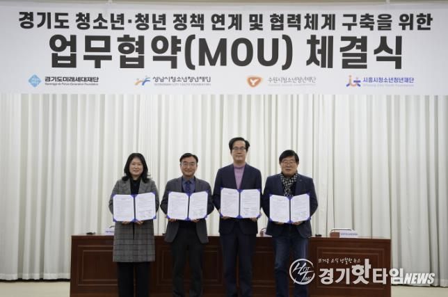 [경기핫타임뉴스=김삼영 기자] (재)시흥시청소년청년재단은 지난 2월 12일 경기도청 옛청사 신관 4층 대회의실에서 경기도미래세대재단, 수원시청소년청년재단, 성남시청소년청년재단과 함께 ‘청소년ㆍ청년 정책 연계 및 협력체계 구축’을 위한 업무협약을 체결했다.