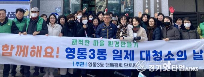 [경기핫타임뉴스=김삼영 기자] 수원시 영통구 영통3동 행정복지센터는 지난 12일 설 명절을 앞두고 지역 환경 정비와 깨끗한 마을 조성을 위해 통장협의회와 함께 ‘설맞이 일제 대청소의 날’을 실시했다.