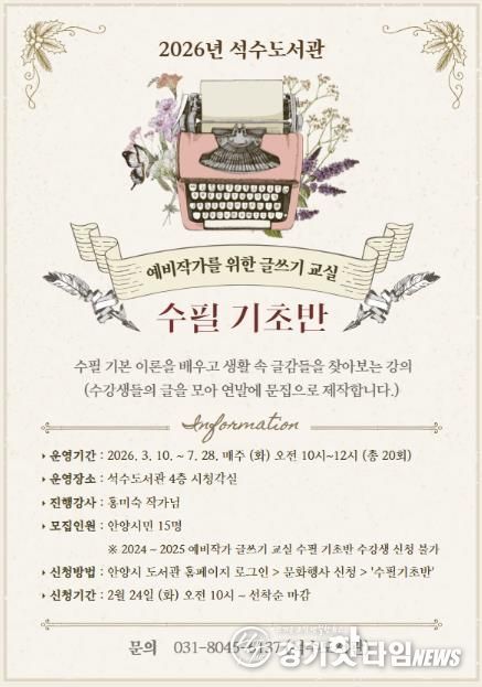[경기핫타임뉴스=김삼영 기자] 안양시 석수도서관은 문학과 글쓰기에 관심 있는 안양 시민을 대상으로 ‘예비작가를 위한 글쓰기 교실’ 수필 기초반 및 소설 창작반을 운영한다고 13일 밝혔다.