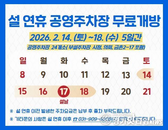 [경기핫타임뉴스=김형철 기자] 파주도시관광공사는 12일, 2026년 설 명절을 맞아 시민과 고향을 방문하는 귀성객의 교통편의를 위해 공영주차장 24곳(부설주차장 시청, 의회, 금촌2-17 포함)을 오는 14일(토)부터 18일(수)까지 5일간 무료로 개방한다고 밝혔다.