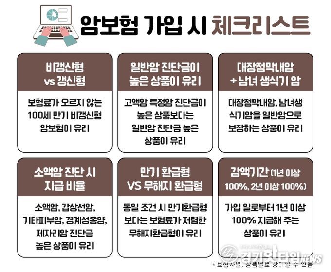 우선, 암보험을 가입하기 위해서는 갱신형 상품과 비갱신형 상품중에서 선택을 해야 한다. 갱신형은 처음 가입 시에는 보험료가 상대적으로 저렴하지만 갱신을 이어가면서 보험료가 계속 인상될 수 있고, 비갱신형은 초기 보험료는 갱신형보다 높을 수 있지만, 가입 후에 보험료인상이 없어 안정적으로 유지관리가 가능한 장점이 있다. 따라서 이러한 장단점을 고려하여 본인의 상황에 맞게 선택하는 것이 좋다.
