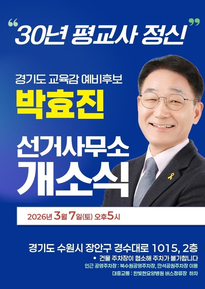 한편, "학교를 알아야 교육을 살린다"라는 슬로건으로 경기도교육감에 도전하는 박효진 예비후보는 3월 7일(토) 오후 5시 선거사무소 개소식을 개최한다.